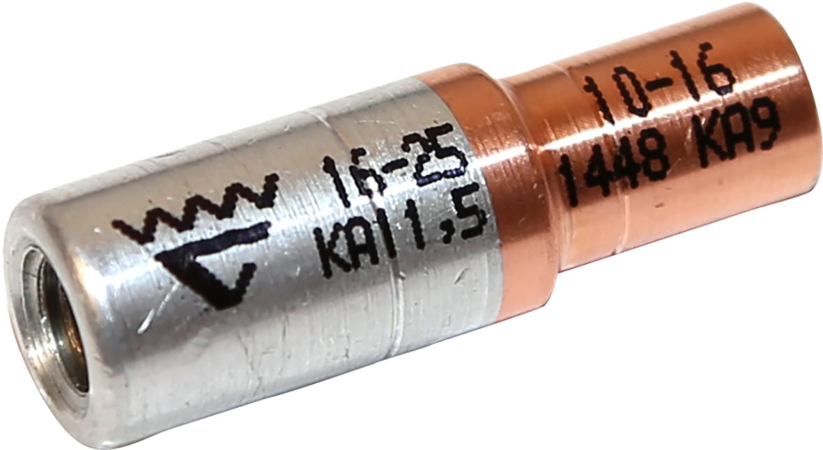 AlCu-Stoßverbinder für den Übergang von mehrdrähtigen Al-Leitern mit 16-25 mm² auf massive, mehrdrähtige, feindrähtige oder Schirmleiter aus Cu mit 10-16 mm². Beim Crimpen des Cu-Teils werden die Pressbacken zwischen der Markierung an der Hülse und der Außenkante positioniert. Verwendung mit dem zertifizierten Elpress-System V600.