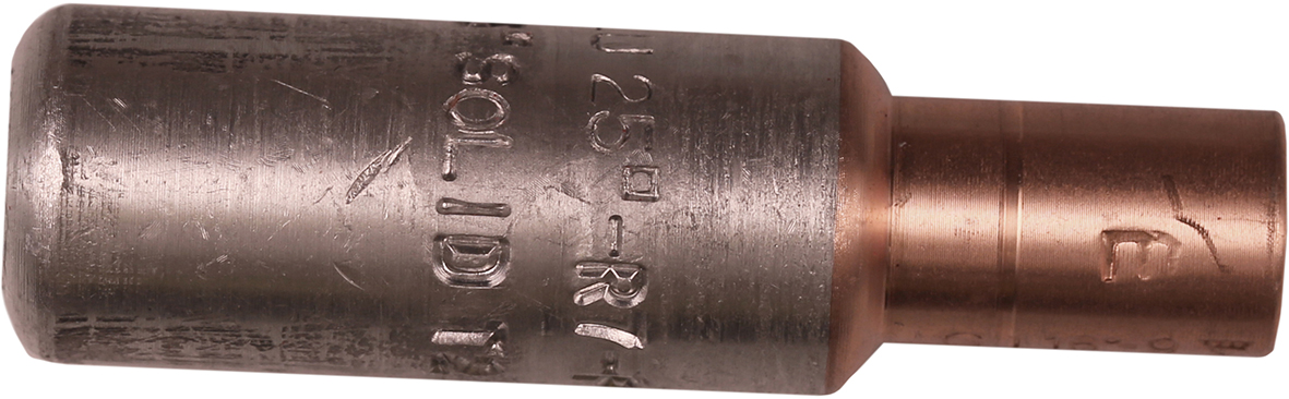 AlCu-Stoßverbinder, zum Verbinden eines Al-Leiters mit einem Cu-Leiter. Für mehrdrähtigen Al-Leiter mit 25 mm² oder massiven Al-Leiter mit 35 mm² auf mehr- oder feindrähtigen Cu-Leiter mit 16 mm². Beim Crimpen des Cu-Teils werden die Pressbacken zwischen der Markierung an der Hülse und der Außenkante positioniert. Verwendung mit den zertifizierten Elpress-Systemen V1300 oder V250.