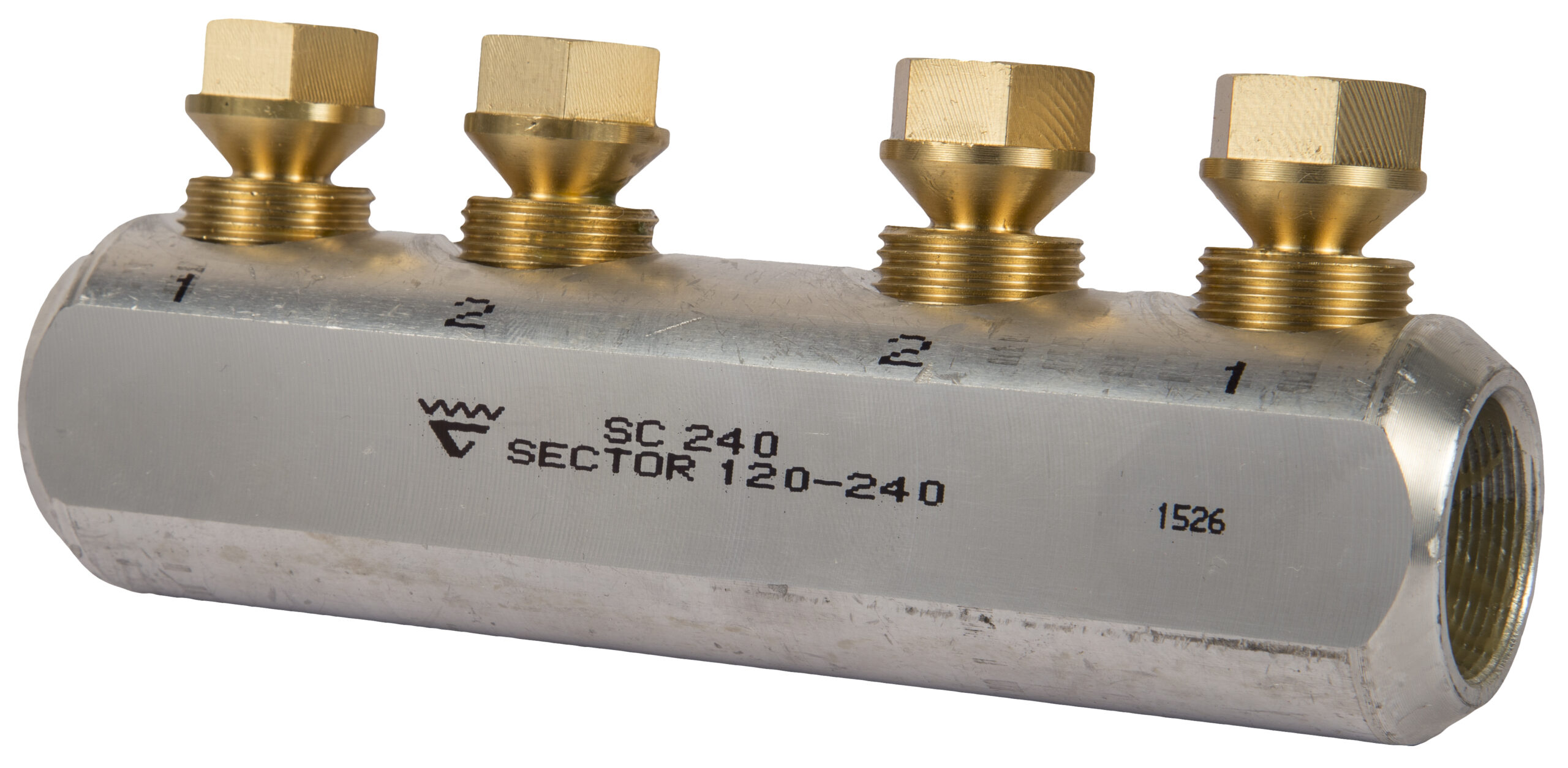 Schraubverbinder 1 kV, passend für Al- und Cu-Leiter der Klasse 1 und 2. Rundleiter 95-240 mm², Sektorleiter 120-240 mm². Beim Verbinden von Schirmleitern mit 29-146 mm² kommt die Einlage SC240/PEN zum Verbinden der Kupferabschirmung des Kabels zum Einsatz.