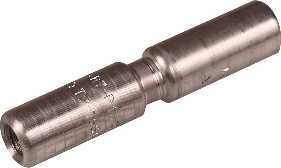 Al through connector with partition for stranded Al cable 25 mm², or for solid Al cable 35 mm². Used for splicing Al conductors of equal areas. Used with Elpress certified systems V1300, V250.