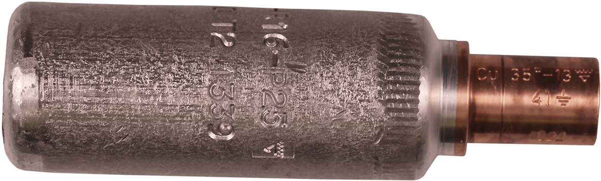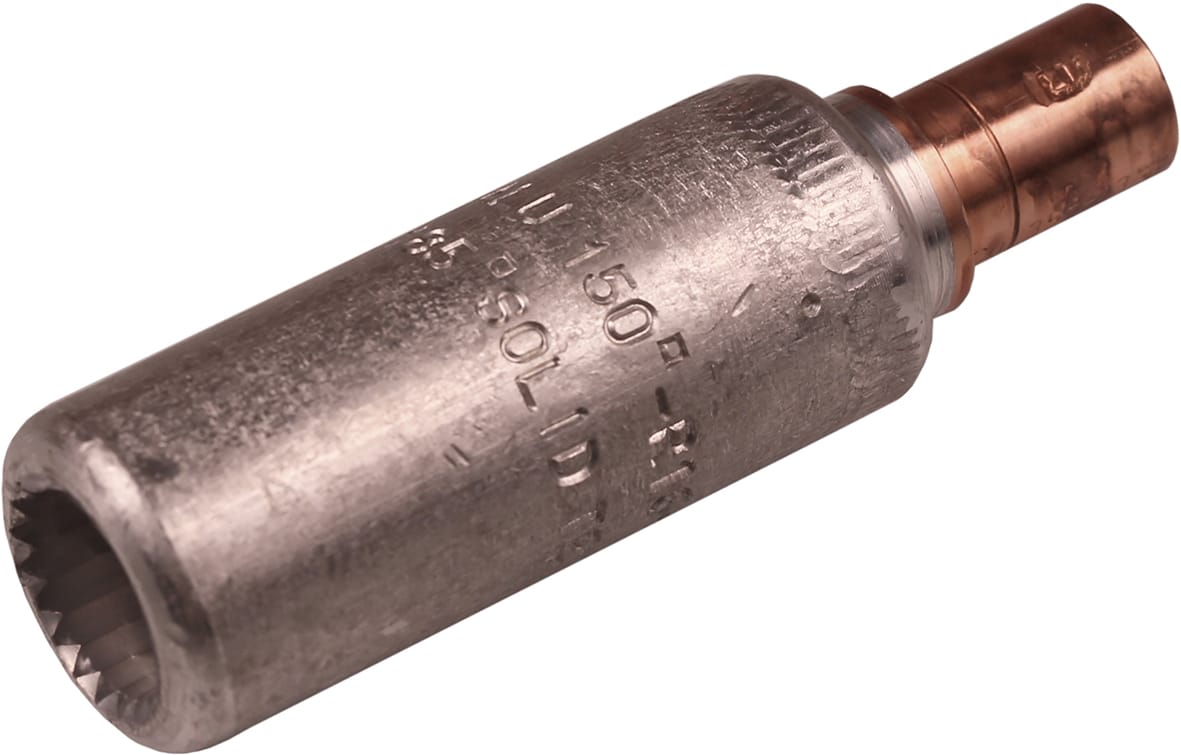AlCu through connector, from Al conductor to Cu conductor. For stranded Al cable 150 mm², or for solid Al cable 185 mm², to stranded/multi-stranded Cu cable 120 mm². When crimping the Cu section, place the dies between the mark on the sleeve and the edge of the Cu section. Used with Elpress certified systems V1300, V250.