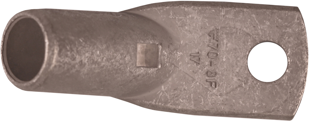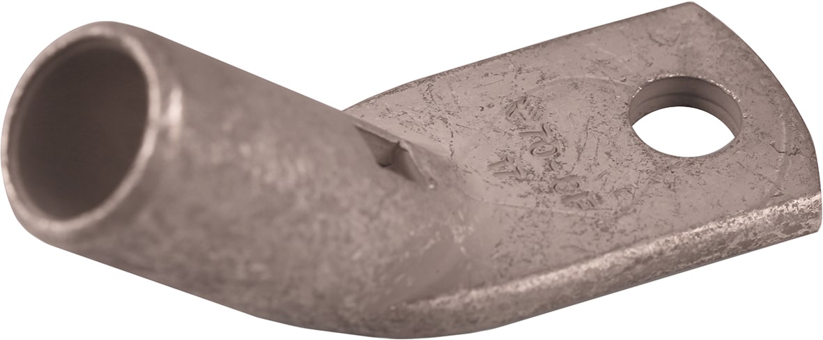 Angled tube terminal 45° for multi-stranded (class 5) and stranded (class 2) Cu conductors (acc. to IEC 60228), 70 mm², with an M8 hole in the palm. Used with Elpress certified systems V600, V1300, V250.