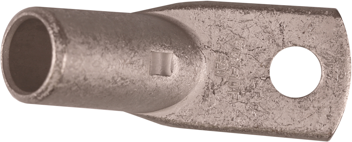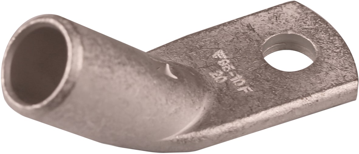 Angled tube terminal 45° for multi-stranded (class 5) and stranded (class 2) Cu conductors (acc. to IEC 60228), 95 mm², with an M16 hole in the palm. Used with Elpress certified systems V600, V1300, V250.
