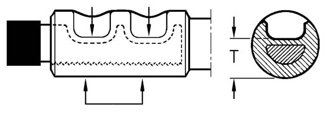 For Al terminals, the measurement ”T” must be checked, which is measured at the bottom of the indent that the punch has achieved on the terminal. This is best done with special calipers, contact Elpress if necessary. Compare measured ”T” measurement with table. If the ”T” measurement is exceeded, after indented crimping, contact the nearest Elpress Service.