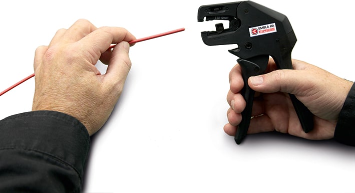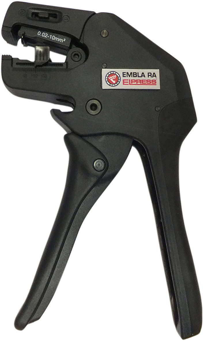 Cutting and stripping tool with V-shaped blades for harder insulation, 0.1-4 mm². Cutting capacity: on multi-wire conductors 10 mm², single-wire conductors 1.5 mm². EMBLA RA (right-angled) is a variant of EMBLA, with a right-angled head, which facilitates work at a workbench.