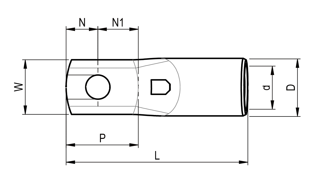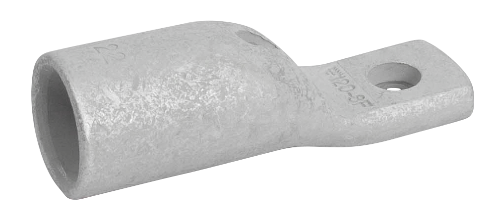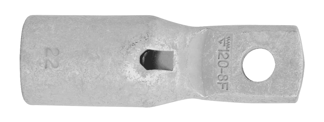 Tube terminal with narrow palm for multi-stranded (class 5) and stranded (class 2) Cu conductors (acc. to IEC 60228), 120 mm², with an M8 hole in the palm. Used with Elpress certified systems V600, V1300, V250.