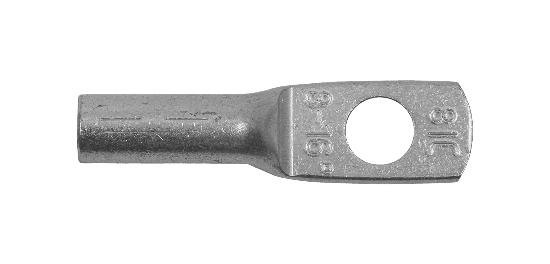 Tube terminal for multi-stranded (class 5) and stranded (class 2) Cu conductors (acc. to IEC 60228), 16 mm², with an M8 hole in the palm. Used with Elpress certified systems V600, V1300.