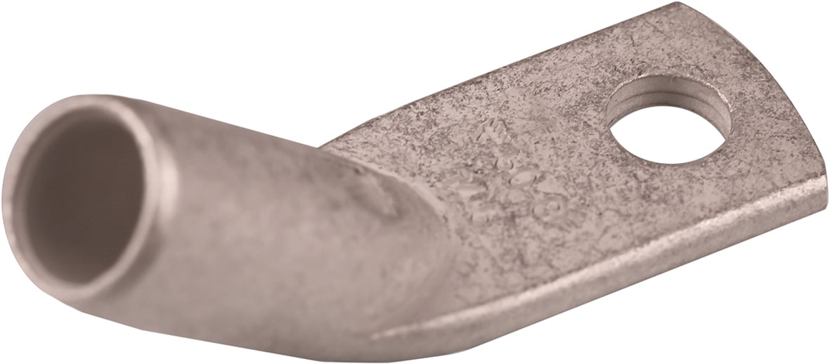 Angled tube terminal 45° for multi-stranded (class 5) and stranded (class 2) Cu conductors (acc. to IEC 60228), 50 mm², with an M12 hole in the palm. Used with Elpress certified systems V600, V1300, V250.